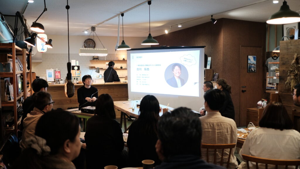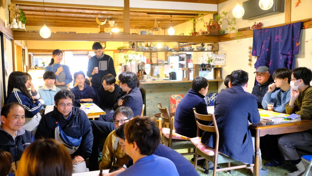 「まちづくりカフェ」では、地元で人気の月あかりカフェさんのお声がけ協力もあり、高校生から子どもを連れて3世代で参加してくれた親子の方まで、学生、主婦、公務員、自営業、民間企業など、属性も世代も幅広い方々が集まってくれました。プログラムはまちづくりナイトと同様の流れでしたが、会場の雰囲気や時間帯、天候の影響もあり、会場はこれからのまちづくりの動きにワクワクするような熱気に包まれていました。